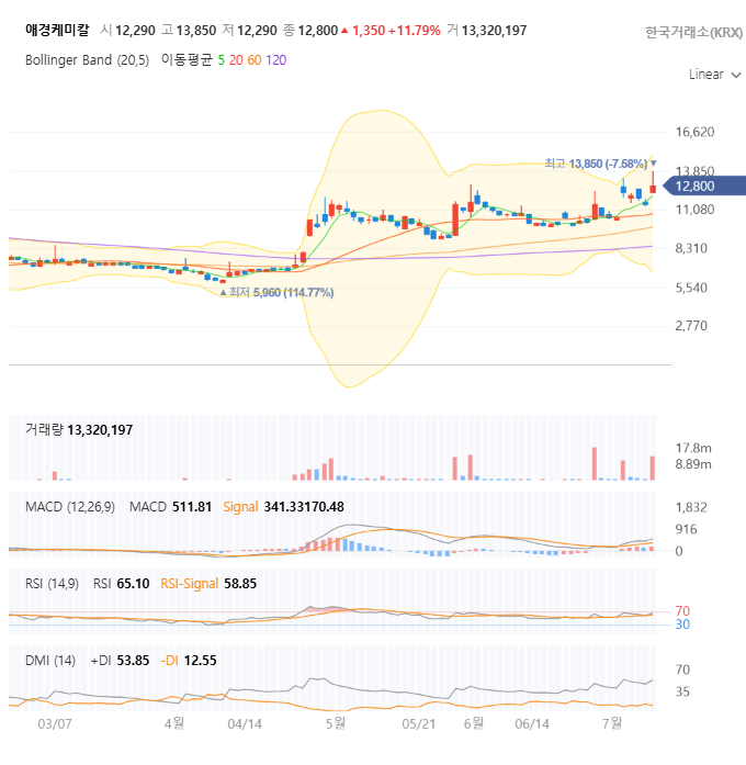 펀더멘탈이 '기대감'이라면, 차트는 '현재 투자자들의 심리'를 보여주는 거울입니다. 현재 애경케미칼의 차트는 아주 흥미로운 이야기를 들려주고 있습니다.