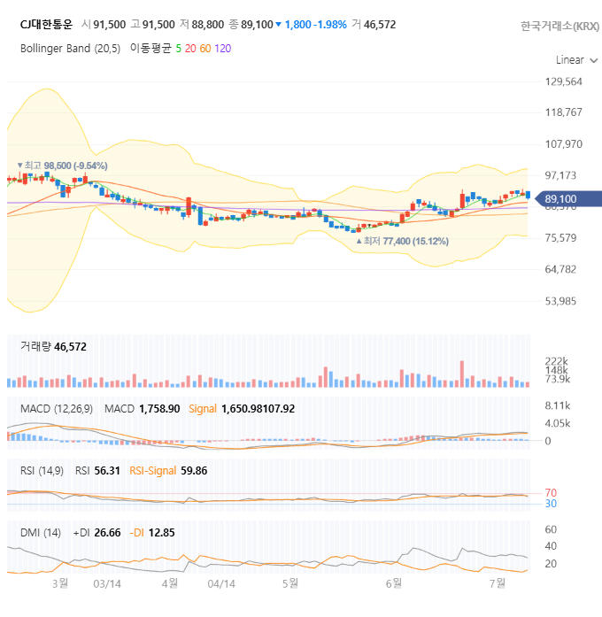 자, 이제 가장 궁금해하실 차트를 볼 시간입니다. 다행히도 희망적인 신호들이 몇 가지 보이네요. 첫째, DMI 지표를 보면 상승 추세의 힘을 나타내는 +DI(26.66)가 하락 추세의 힘인 -DI(12.85)보다 훨씬 위쪽에 있습니다. 이는 여전히 매수세가 우위에 있다는 긍정적인 신호입니다. 둘째, 지난 5월에 기록한 저점(77,400원) 이후 꾸준히 저점을 높여가며 상승 채널을 만들려는 시도가 보입니다.